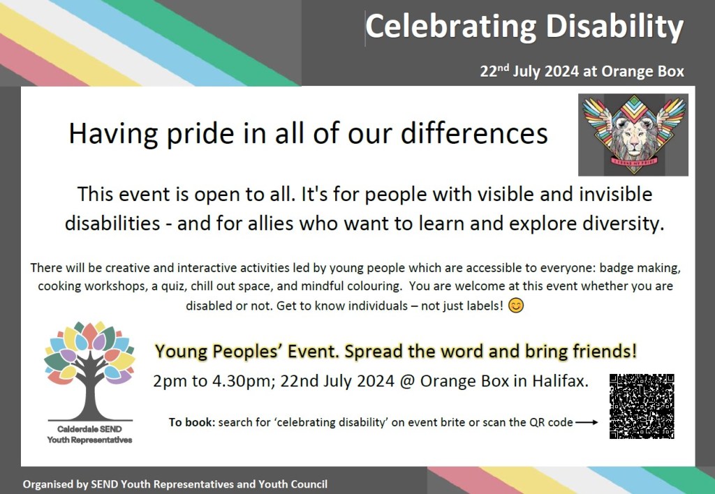 Disability Pride Young Peoples Event July 19, 2024July 19, 2024 / helloitssarahdyer Young Peoples Voice Team and Send Youth Representatives are Inviting young people from across Calderdale to a fun afternoon session where they can come along and celebrate their difference in abilities. Eventbrite link for tickets Share this: Click to share on Facebook (Opens in new window) Facebook Click to share on X (Opens in new window) X Click to email a link to a friend (Opens in new window) Email Click to print (Opens in new window) Print Click to share on Pinterest (Opens in new window) Pinterest Click to share on LinkedIn (Opens in new window) LinkedIn Click to share on WhatsApp (Opens in new window) WhatsApp Like Loading...