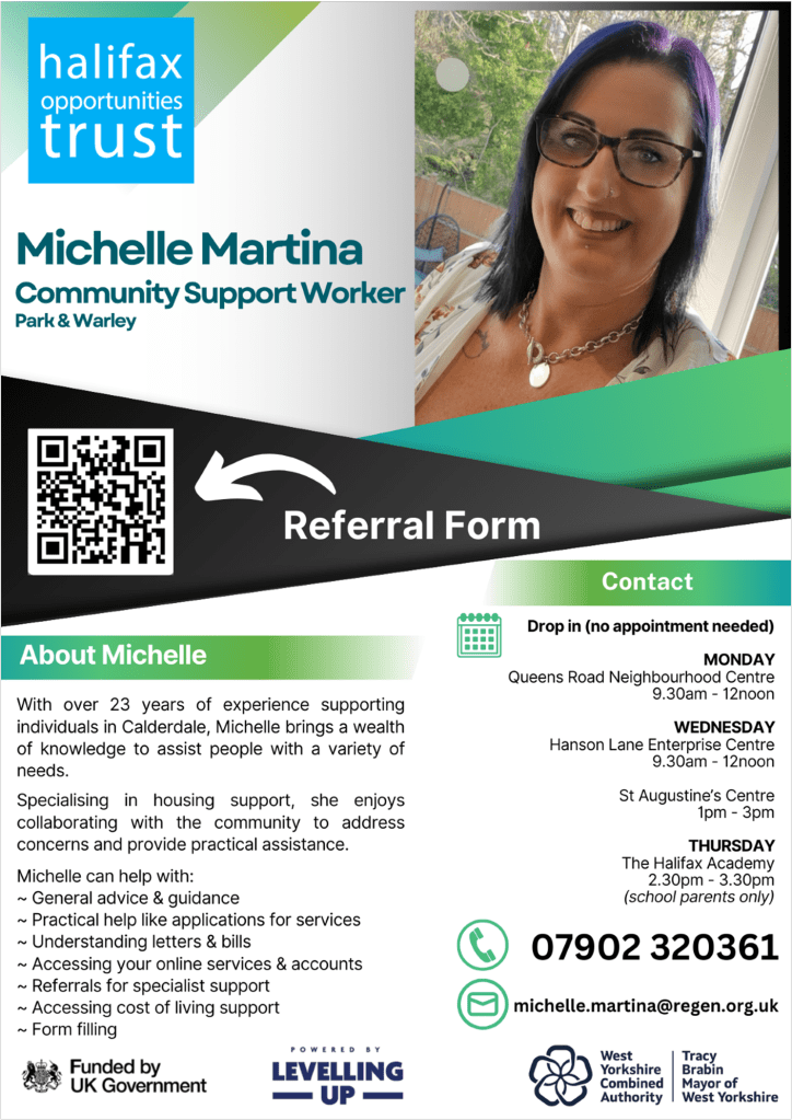 New Community Support Worker at HCI July 23, 2024 / helloitssarahdyer We have a new community support worker at our Monday morning drop in session. Meet Michelle from Halifax Opportunities Trust, you do not need an appointment to drop in and see her at the Queens Rd Neighbourhood Centre. Share this: Click to share on Facebook (Opens in new window) Facebook Click to share on X (Opens in new window) X Click to email a link to a friend (Opens in new window) Email Click to print (Opens in new window) Print Click to share on Pinterest (Opens in new window) Pinterest Click to share on LinkedIn (Opens in new window) LinkedIn Click to share on WhatsApp (Opens in new window) WhatsApp Like Loading...