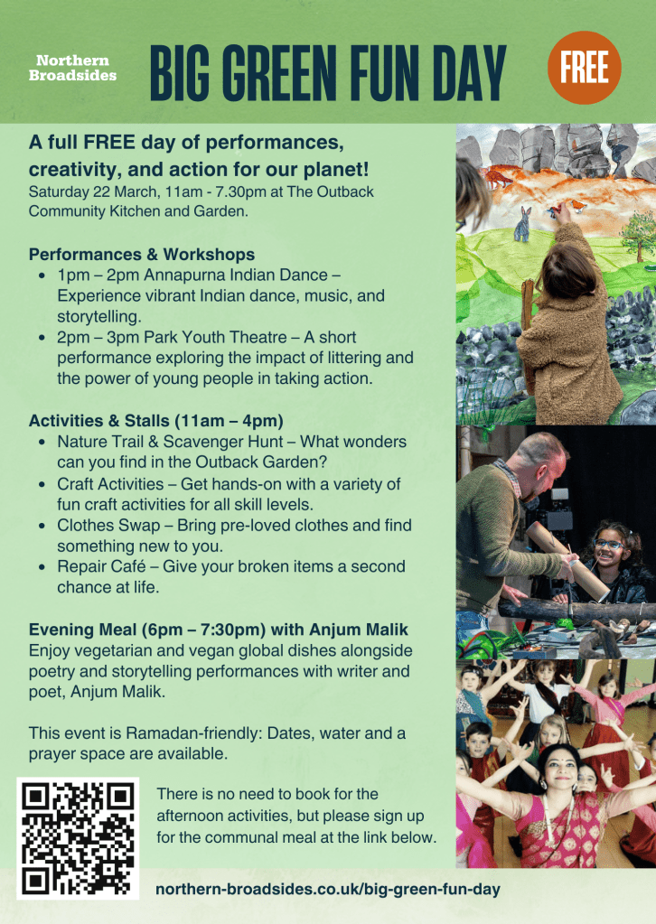 Northern Broadsides Big Green Fun Day March 12, 2025 / helloitssarahdyer A full free day of performances, creativity , and action for our planet. Share this: Click to share on Facebook (Opens in new window) Facebook Click to share on X (Opens in new window) X Click to email a link to a friend (Opens in new window) Email Click to print (Opens in new window) Print Click to share on Pinterest (Opens in new window) Pinterest Click to share on LinkedIn (Opens in new window) LinkedIn Click to share on WhatsApp (Opens in new window) WhatsApp Like Loading...