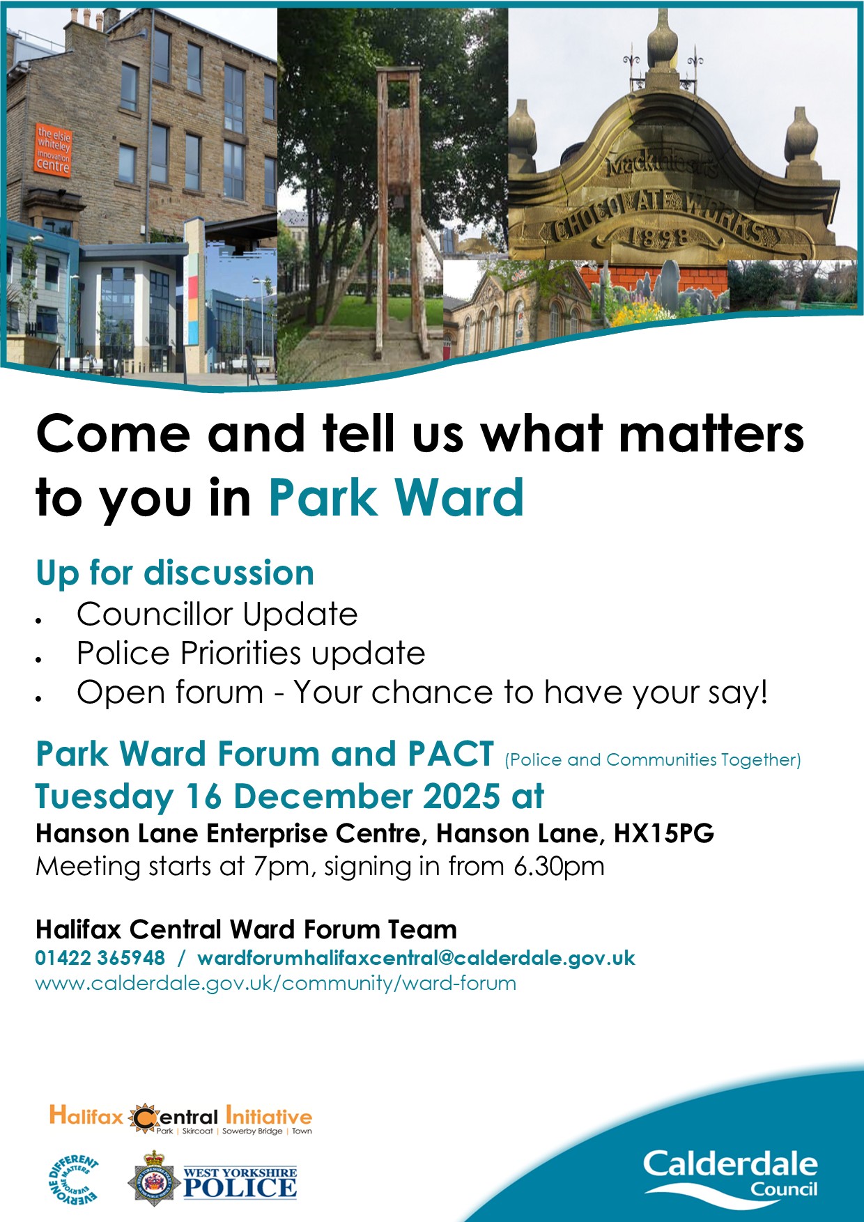 For more information email: wardforumhalifaxcentral@calderdale.gov.uk or Phone 01422 365948